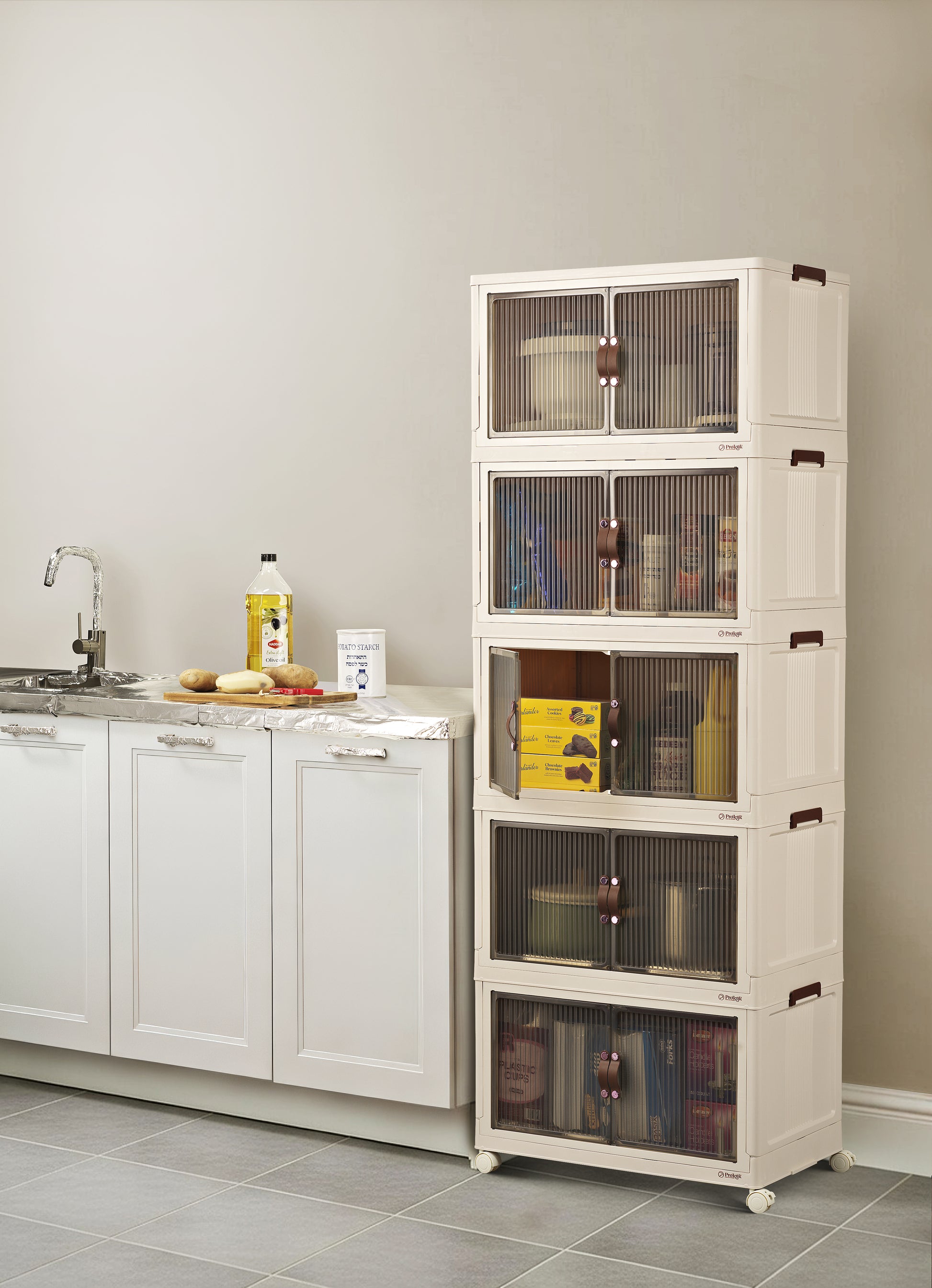 No Pesach kitchen? Even with one, storage space always runs out. Stop emptying cabinets and juggling boxes every year. This Proktik foldable, stackable cabinet creates instant, organized Pesach storage — and folds flat after Pesach for easy storage.